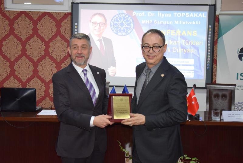 Participants expressed that the conference was an important step towards strengthening unity and solidarity in the Turkish world, allowing them to learn more about Balkan Turks and the Turkish World. İlyas Topsakal's valuable conference received great interest from representatives of political parties, representatives of civil organizations, and many students. At the end of the program, Prof. Dr. Ahmet Vecdi CAN, the Rector of IVU, presented a plaque to Prof. Dr. İlyas TOPSAKAL.