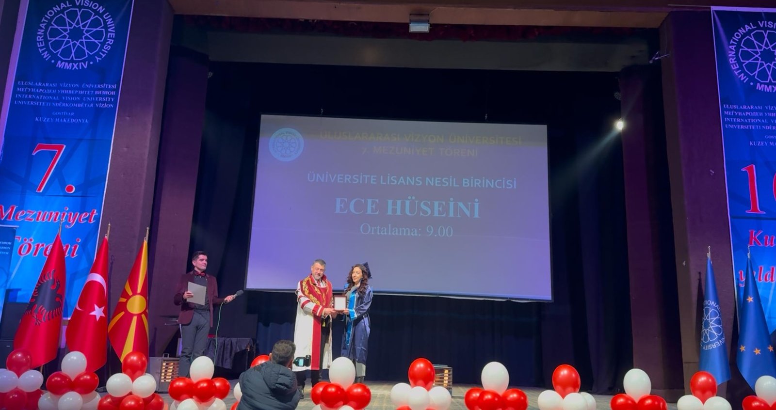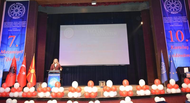 Prof. Dr. Filiz Kılıç, Deputy Chairperson of the Nationalist Movement Party (MHP) at the Grand National Assembly of Turkey, expressed her pleasure in attending the ceremony. She said, “The achievements of International Vision University are of great importance not only for the Turkish community in North Macedonia but for the entire region. I hope these educational successes continue to grow.” Kılıç also conveyed greetings from MHP Chairman Devlet Bahçeli, along with those from the Grand National Assembly of Turkey.