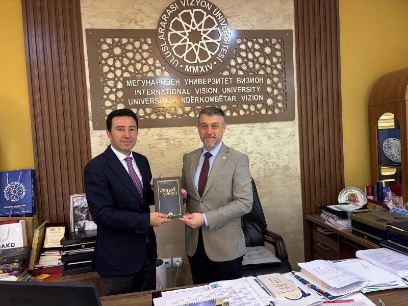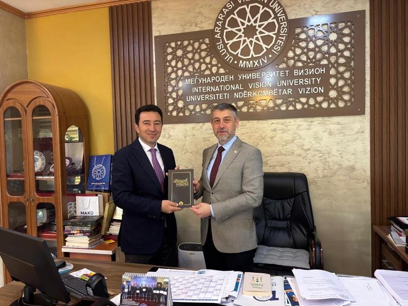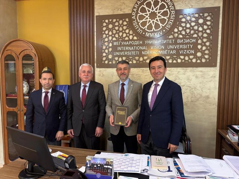 Ankara Hacı Bayram Veli Üniversitesi İktisadi ve İdari Bilimler Fakültesi Dekanı Prof. Dr. Fırat PURTAŞ, Ahmet Yesevi Üniversitesi Genel Sekreteri Ahmet Şevki ZENGIN ve Kuzey Makedonya Maarif Vakfı Ülke Temsilcisi Osman DEMİRGÜL, Uluslararası Vizyon Üniversitesi Rektörü Prof. Dr. Ahmet Vecdi CAN’ı makamında ziyaret etti.